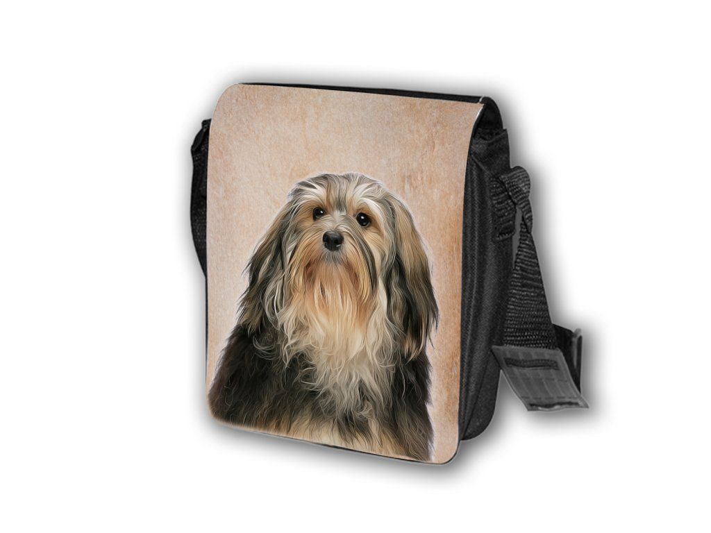 Nylonová vycházková taška s popruhem přes rameno, černé barvy. Velikost tašky je 21x20 cm. Na omyvatelné, odnímatelné ploše velikosti 17x20 cm je krásný paint potisk Havanský psík.