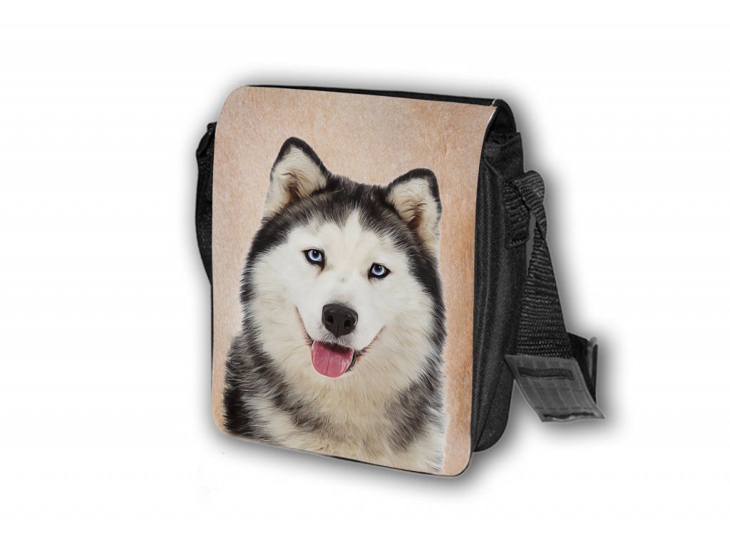 Nylonová vycházková taška s popruhem přes rameno, černé barvy. Velikost tašky je 21x20 cm. Na omyvatelné, odnímatelné ploše velikosti 17x20 cm je krásný paint potisk Husky.