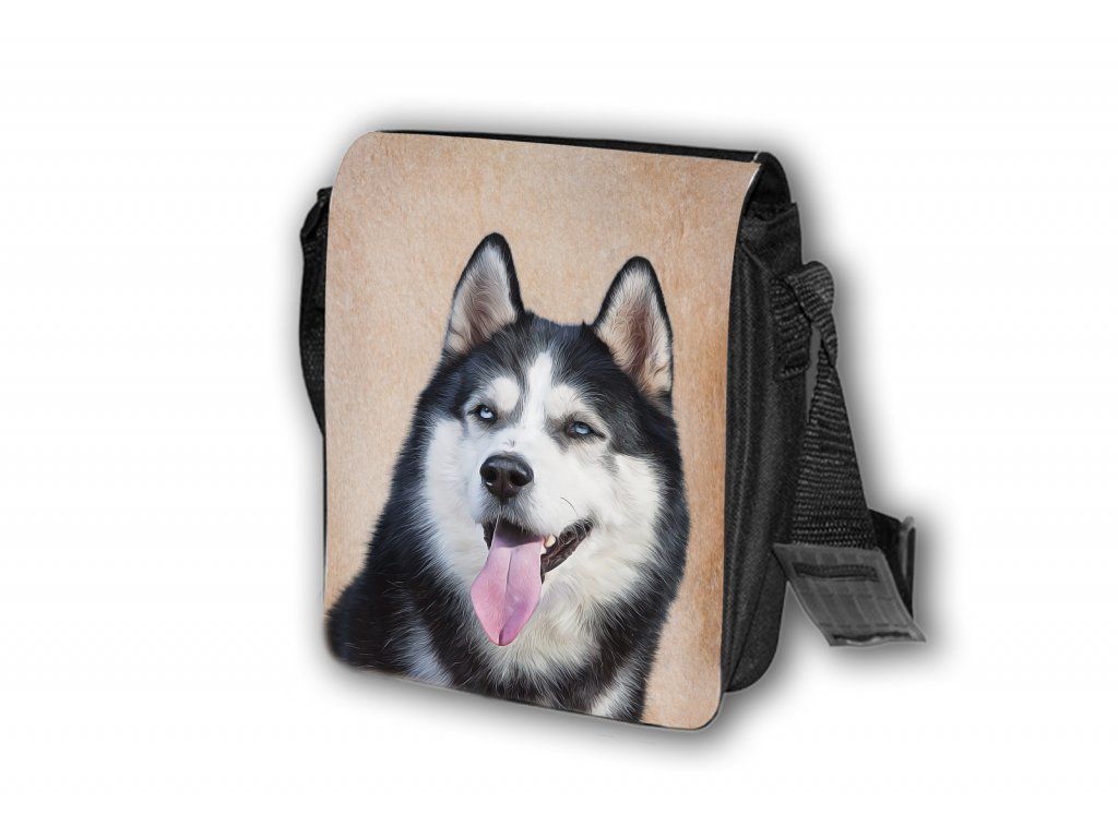 Nylonová vycházková taška s popruhem přes rameno, černé barvy. Velikost tašky je 21x20 cm. Na omyvatelné, odnímatelné ploše velikosti 17x20 cm je krásný paint potisk Husky.