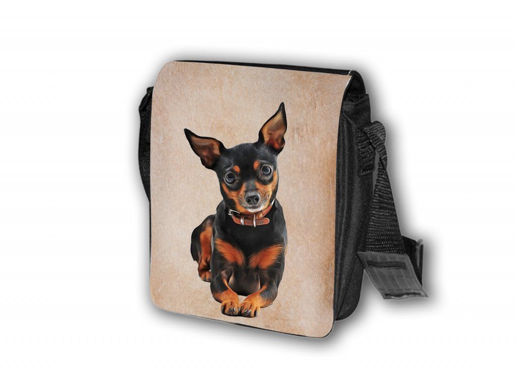 Nylonová vycházková taška s popruhem přes rameno, černé barvy. Velikost tašky je 21x20 cm. Na omyvatelné, odnímatelné ploše velikosti 17x20 cm je krásný paint potisk Pražský krysařík.
