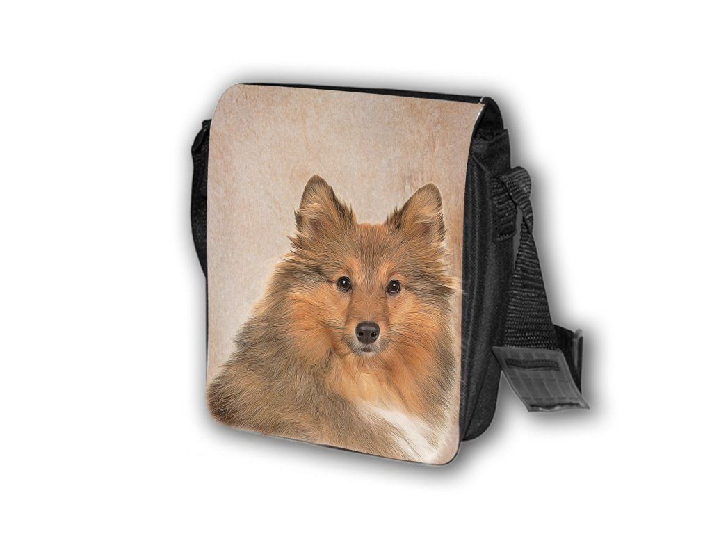 Nylonová vycházková taška s popruhem přes rameno, černé barvy. Velikost tašky je 21x20 cm. Na omyvatelné, odnímatelné ploše velikosti 17x20 cm je krásný paint potisk Šeltie.