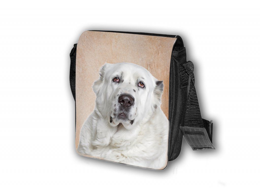 Nylonová vycházková taška s popruhem přes rameno, černé barvy. Velikost tašky je 21x20 cm. Na omyvatelné, odnímatelné ploše velikosti 17x20 cm je krásný paint potisk Středoasijský pastevecký pes.
