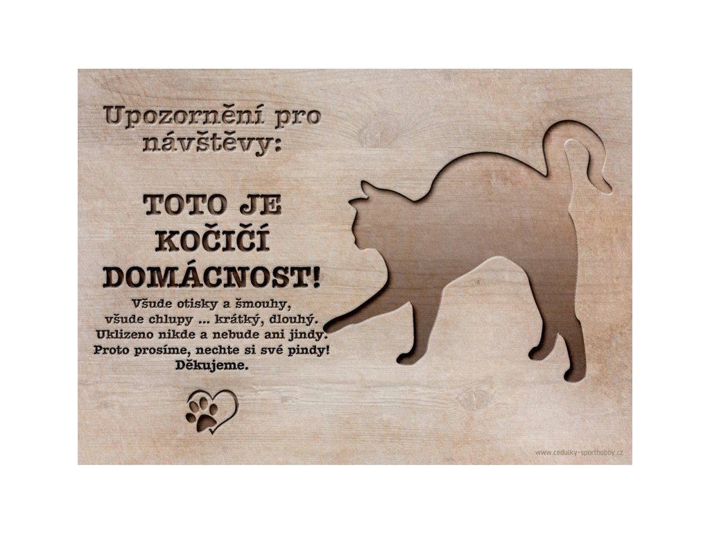 Vtipná cedulka s nápisem "Kočičí domácnost ...". Kovová cedulka s potiskem. Velikosti této cedulky je 18x12,8 cm. Cedulky jsou tištěny sublimační technologií Grawerton přímo na plech.
