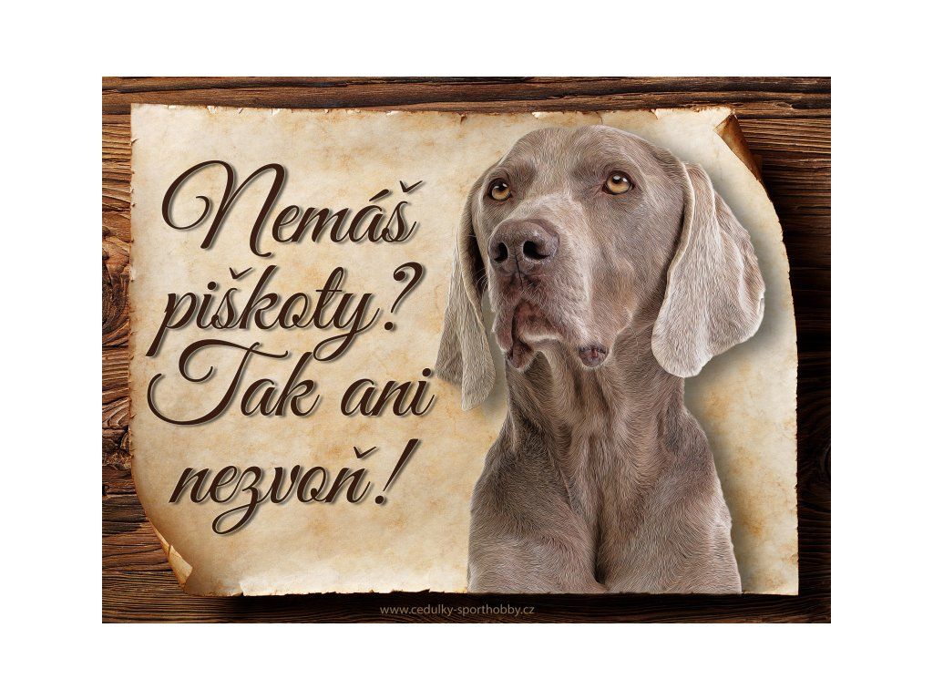 Cedulka s Výmarským ohařem II, hliníková s nápisem "Nemáš piškoty? Tak ani nezvoň!" Kovová výstražná venkovní cedulka oznamující to či ono, že se ve vašem obydlí může návštěvník setkat s vašim čtyřnohým miláčkem a jeho teritoriem. Velikosti těchto cedulek jsou 15x11,25 a 20x15 cm. Cedulky jsou tištěny sublimační technologií Grawerton přímo na plech. Cedulky dodáváme běžně se zakulacenými rohy. Pokud budete chtít na cedulku vlastní text, napište nám jej do poznámky.