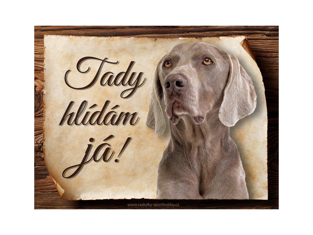 Cedulka s Výmarským ohařem II, hliníková s nápisem "Tady hlídám já!" Kovová výstražná venkovní cedulka oznamující to či ono, že se ve vašem obydlí může návštěvník setkat s vašim čtyřnohým miláčkem a jeho teritoriem. Velikosti těchto cedulek jsou 15x11,25 a 20x15 cm. Cedulky jsou tištěny sublimační technologií Grawerton přímo na plech. Cedulky dodáváme běžně se zakulacenými rohy. Pokud budete chtít na cedulku vlastní text, napište nám jej do poznámky.