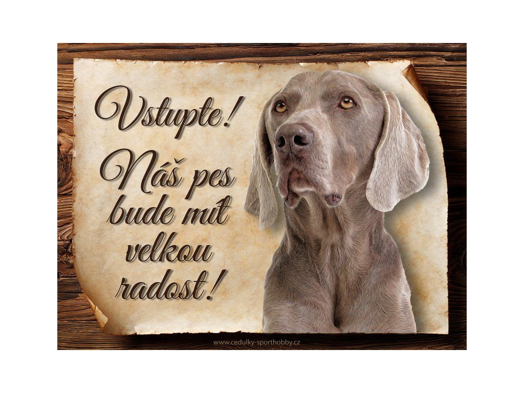 Cedulka s Výmarským ohařem II, hliníková s nápisem "Vstupte! Náš pes bude mít velkou radost!" Kovová výstražná venkovní cedulka oznamující to či ono, že se ve vašem obydlí může návštěvník setkat s vašim čtyřnohým miláčkem a jeho teritoriem. Velikosti těchto cedulek jsou 15x11,25 a 20x15 cm. Cedulky jsou tištěny sublimační technologií Grawerton přímo na plech. Cedulky dodáváme běžně se zakulacenými rohy. Pokud budete chtít na cedulku vlastní text, napište nám jej do poznámky.