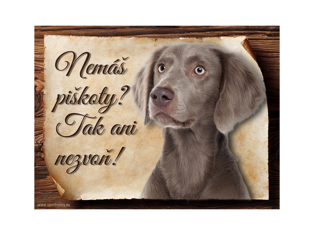 Cedulka s Výmarským ohařem, hliníková s nápisem "Nemáš piškoty? Tak ani nezvoň!" Kovová výstražná venkovní cedulka oznamující to či ono, že se ve vašem obydlí může návštěvník setkat s vašim čtyřnohým miláčkem a jeho teritoriem. Velikosti těchto cedulek jsou 15x11,25 a 20x15 cm. Cedulky jsou tištěny sublimační technologií Grawerton přímo na plech. Cedulky dodáváme běžně se zakulacenými rohy. Pokud budete chtít na cedulku vlastní text, napište nám jej do poznámky.