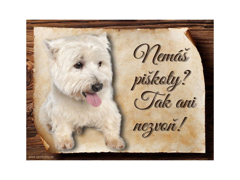 Cedulka s Westíkem, hliníková s nápisem "Nemáš piškoty? Tak ani nezvoň!" Kovová výstražná venkovní cedulka oznamující to či ono, že se ve vašem obydlí může návštěvník setkat s vašim čtyřnohým miláčkem a jeho teritoriem. Velikosti těchto cedulek jsou 15x11,25 a 20x15 cm. Cedulky jsou tištěny sublimační technologií Grawerton přímo na plech. Cedulky dodáváme běžně se zakulacenými rohy. Pokud budete chtít na cedulku vlastní text, napište nám jej do poznámky.